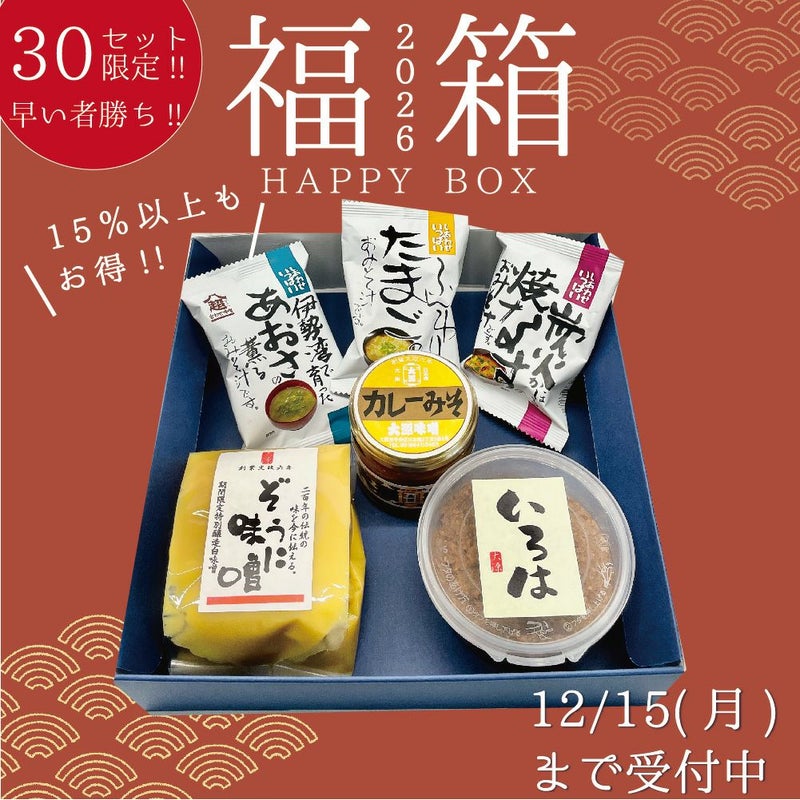 ついに登場!!新春福箱!! なかみはなんと!プレミアム醸造みそ【いろは】をはじめ、大源味噌が誇る人気商品、季節商品を集めました。新春かぎりの特別価格でのご提供です!ぜひお試しください!