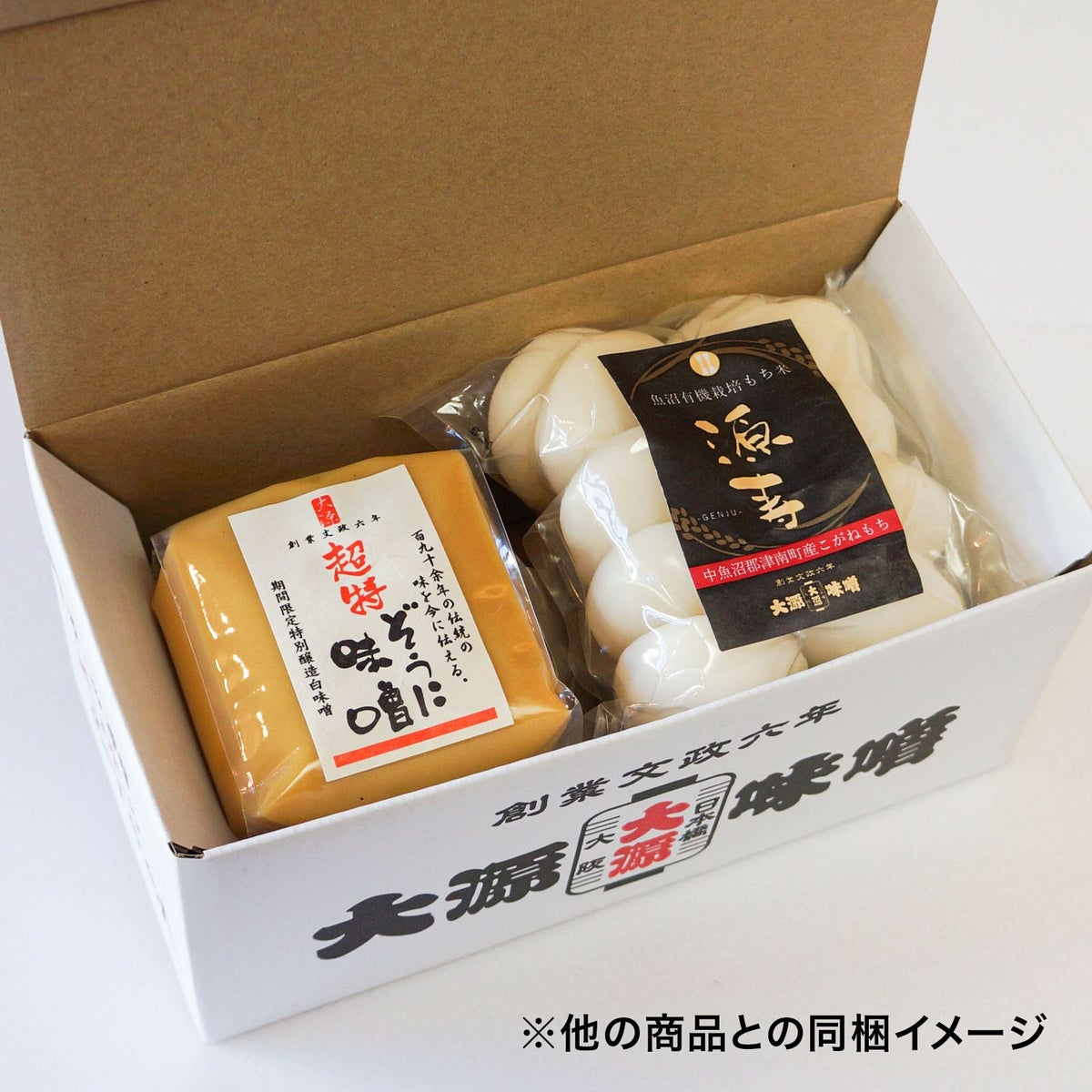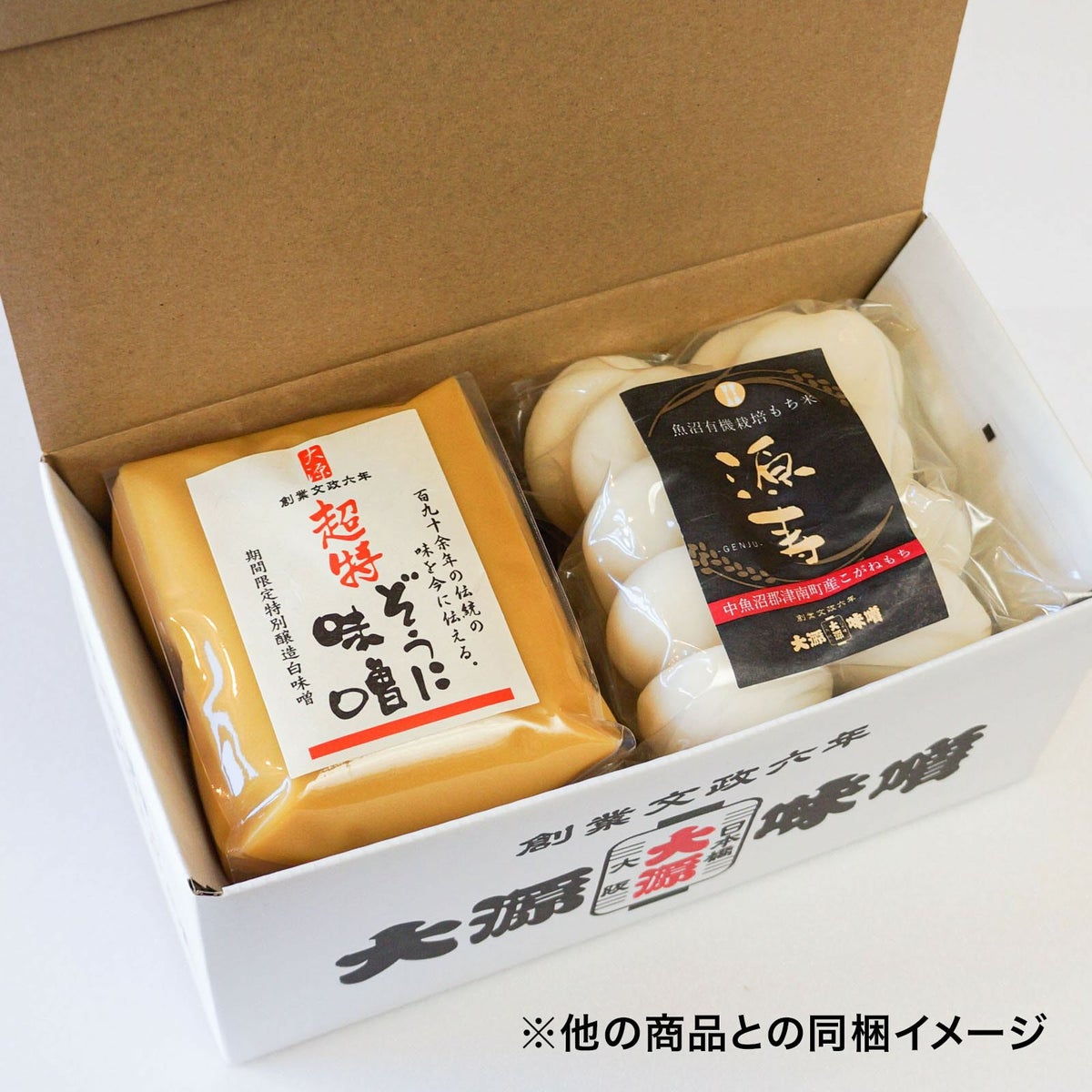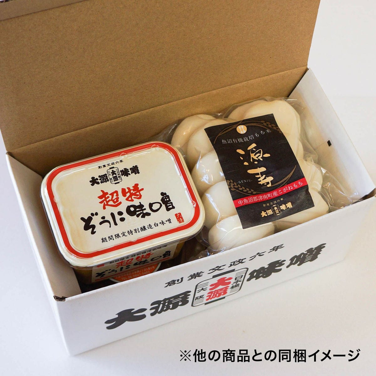 他の画像を見る 最高級国産素材の究極の白味噌と魚沼産こがね丸餅の豪華セット(12月限定) 超特ぞうに味噌500g・源寿450g×2 お雑煮セット 販売価格 ¥ 7,560 税込 在庫切れ 詳細を見る お気に入りに登録する