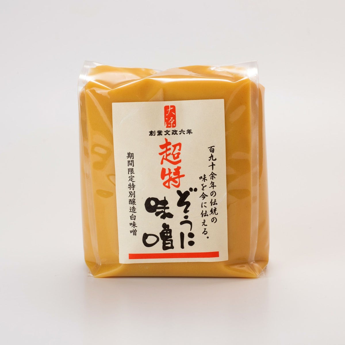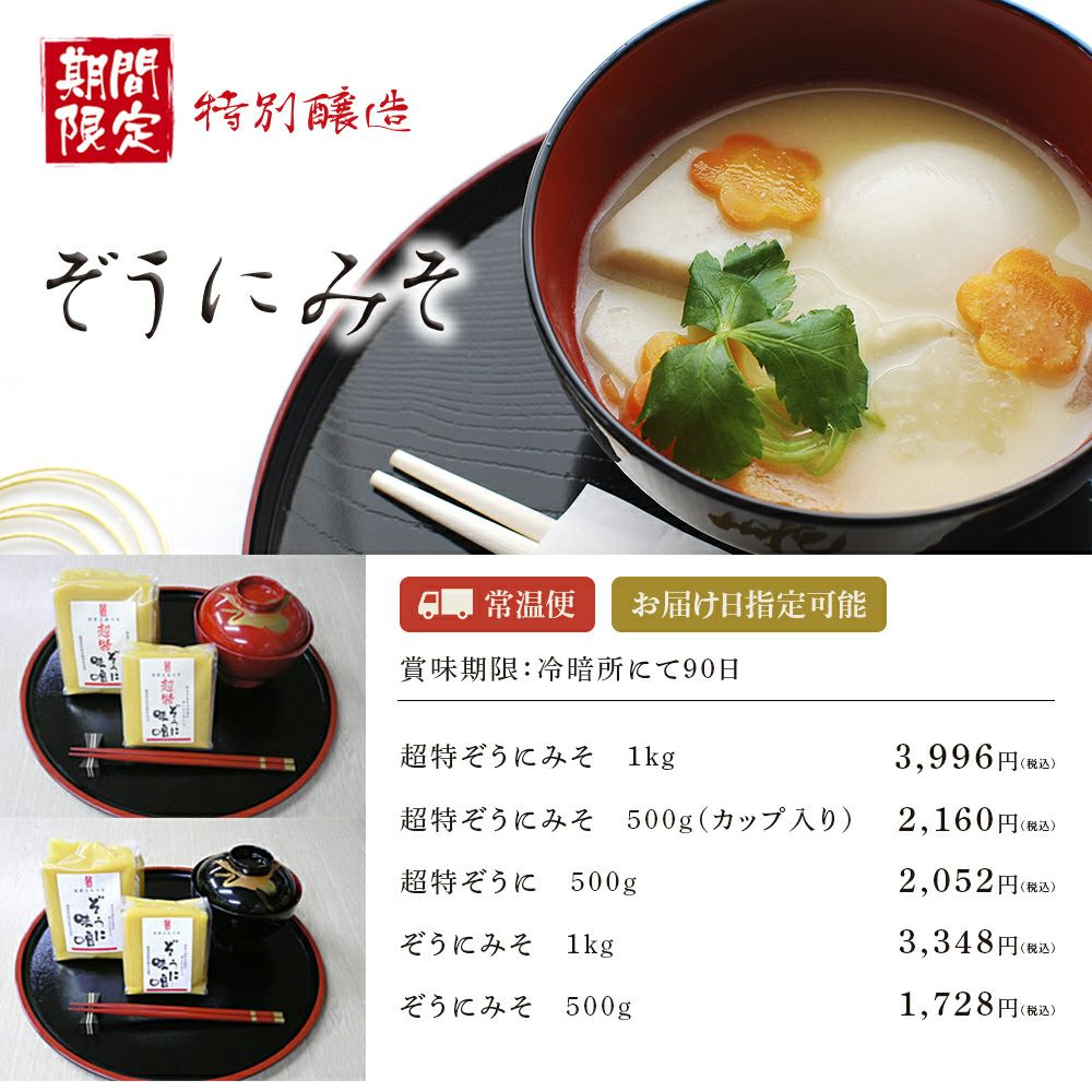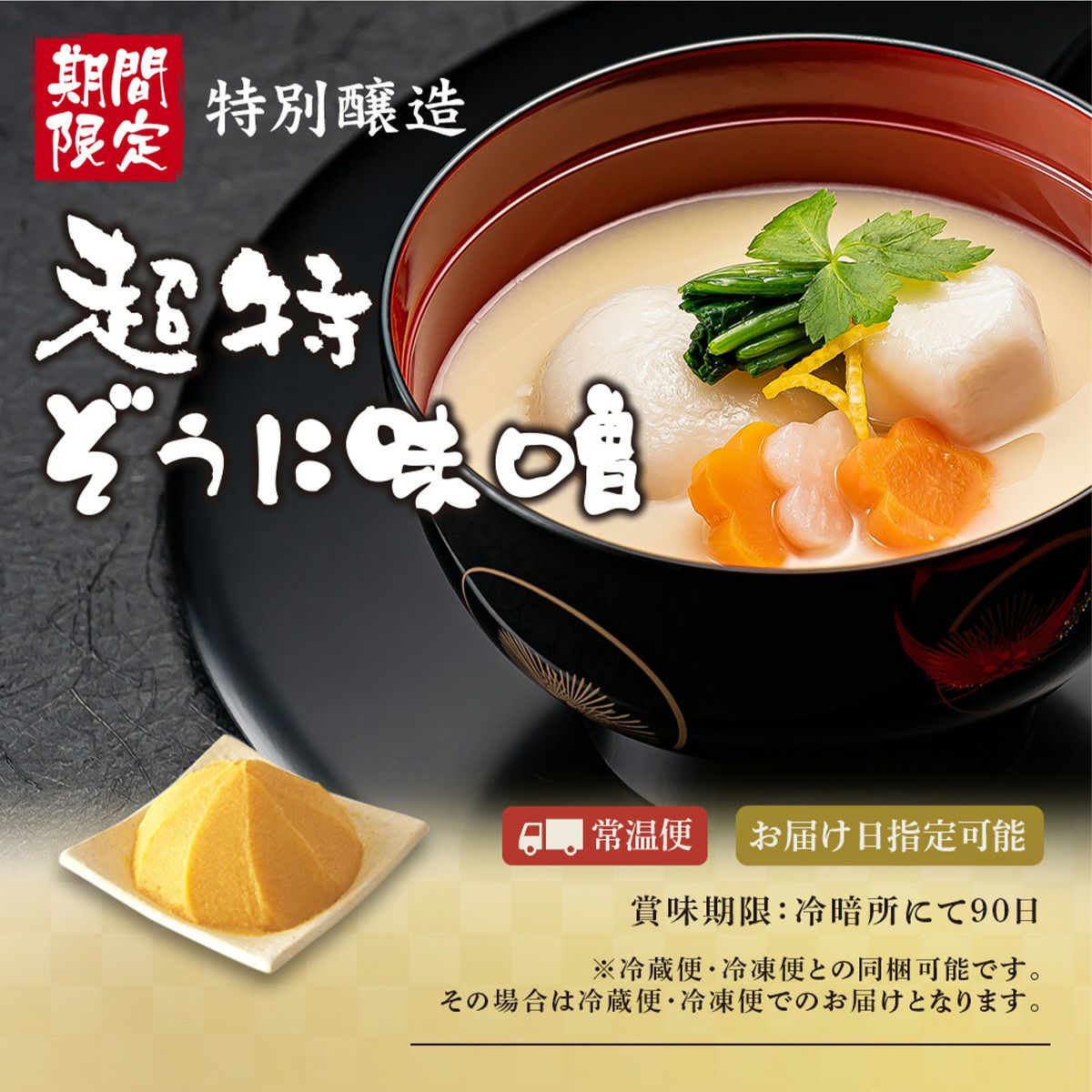 他の画像を見る 最高級国産素材の究極の白味噌と魚沼産こがね丸餅の豪華セット(12月限定) 超特ぞうに味噌500g・源寿450g×2 お雑煮セット 販売価格 ¥ 7,560 税込 在庫切れ 詳細を見る お気に入りに登録する