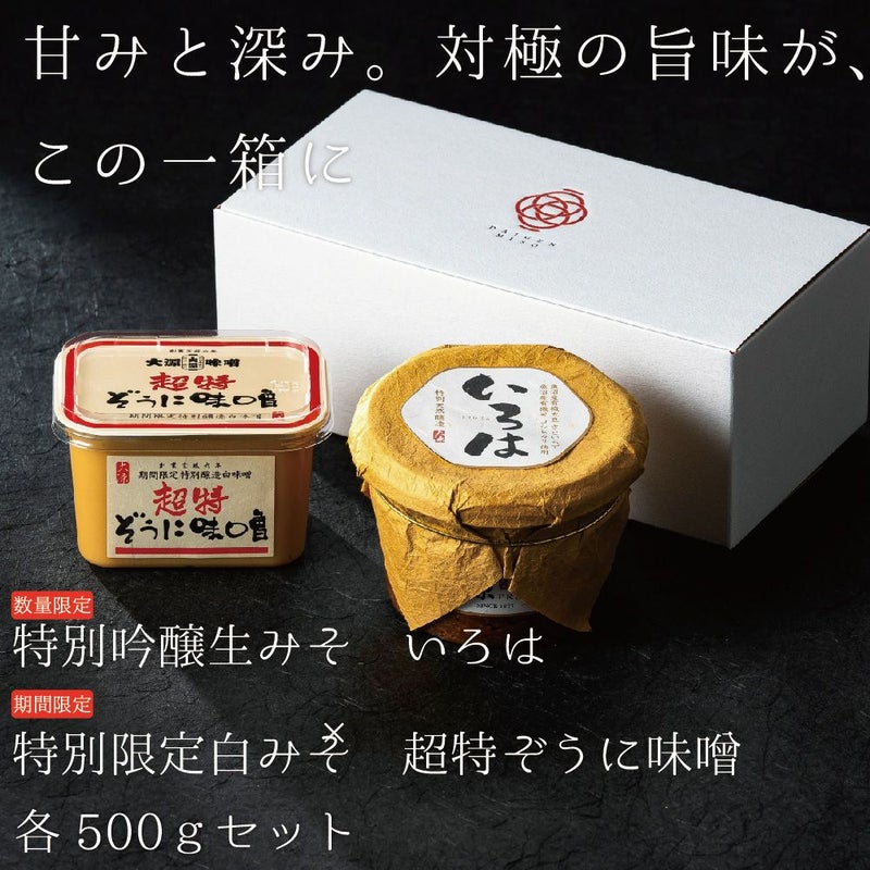 国産の大鶴大豆と国産のコシヒカリ、赤穂産の塩等、超一流の素材を使用して30割もの麹歩合で造り上げた究極の白味噌とプレミアム醸造味噌いろはの贅沢なセットが登場、関西風のおぞうに等に仕立てればまさに絶品な甘味といろはの深みを同時に味わえる