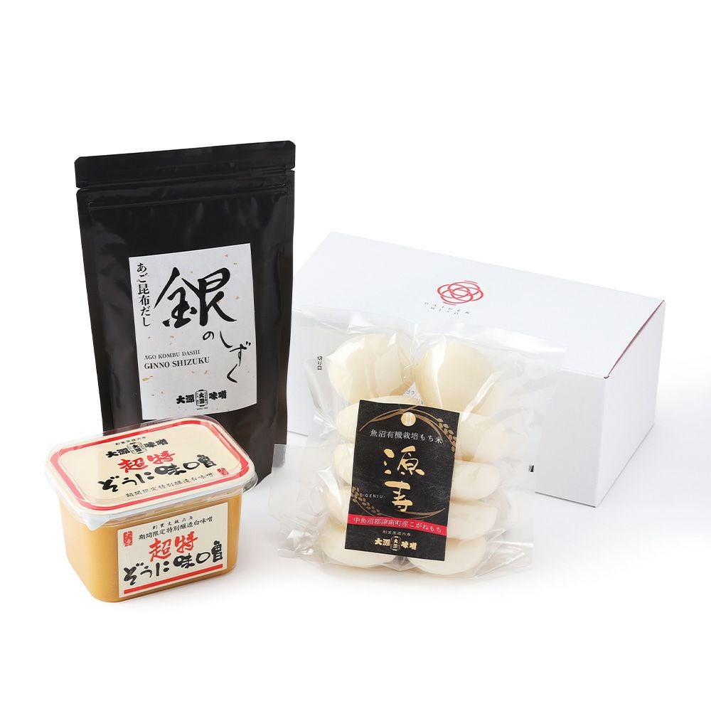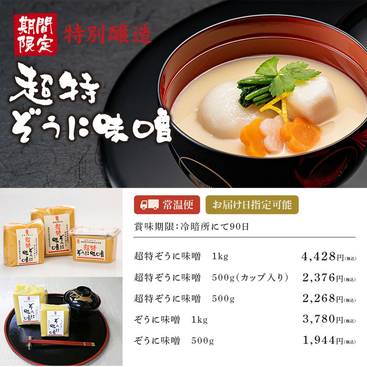 他の画像を見る 最高級国産素材の究極の白味噌と魚沼産こがね丸餅の豪華セット(12月限定) 超特ぞうに味噌500g・源寿450g×2 お雑煮セット 販売価格 ¥ 7,560 税込 在庫切れ 詳細を見る お気に入りに登録する